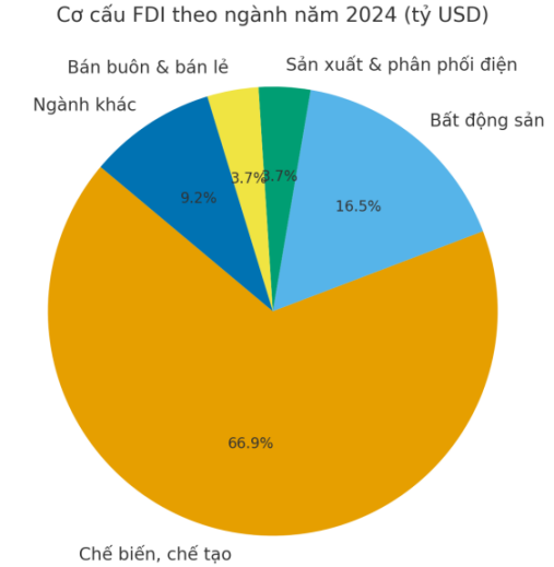Theo Vietnam Investment Snapshot, trong Q1/2025, ngành sản xuất chiếm ~ 61,9 % tổng vốn đăng ký FDI mới.