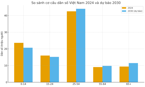 Biểu đồ so sánh cơ cấu dân số Việt Nam năm 2024 và dự báo 2030 cho thấy xu hướng già hóa dân số ngày càng rõ rệt.